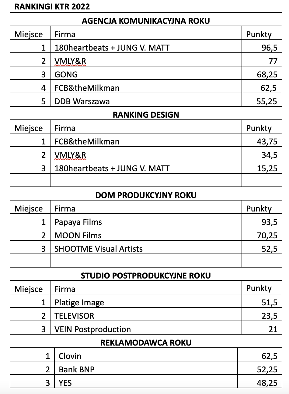 W rankingu na pierwszej pozycji utrzymały się: Papaya Films wśród domów produkcyjnych oraz Platige Image – jako Studio Postprodukcyjne Roku.