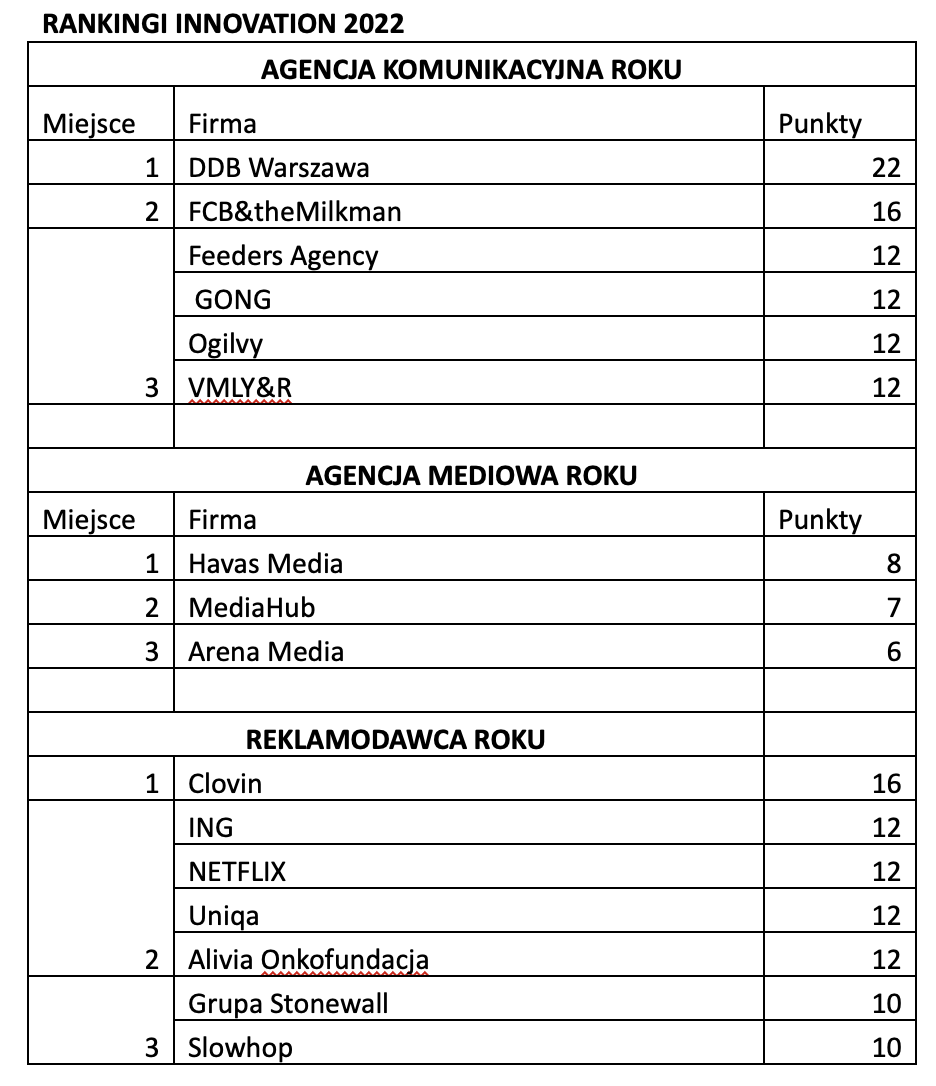 Agencją Roku Innovation zostało DDB Warszawa. Nagrodę Agencji Mediowej Roku przyznano Havas Media.