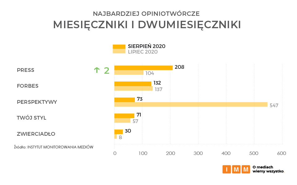 Najczęściej cytowanym – 208 razy – tytułem kategorii w sierpniu okazał się miesięcznik Press, na który często powoływano się w związku z publikacją szczegółowych informacji nt. powołania przez Radę Mediów Narodowych na prezesa Telewizji Polskiej Jacka Kurskiego. Na kolejnych miejscach podium znalazły się magazyny Forbes oraz Perspektywy. Do rankingu zaklasyfikował się również tytuł Zwierciadło, w przypadku którego redaktorzy opublikowali na łamach pisma list Macieja Sthura do córki Matyldy, która skończyła w tym roku 20 lat.