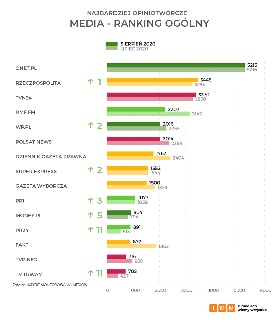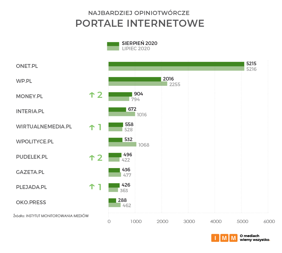 Na podium Onet.pl (5,2 tys. cytowań), za nim portal Wp.pl z wynikiem 2 tys. cytowań. Na miejscu trzecim ze wzrostem o dwie pozycje w stosunku do lipca Money.pl cytowany ponad 900 razy między innymi za sprawą wywiadu z początku sierpnia z ówczesnym ministrem zdrowia Łukaszem Szumowskim, w którym polityk zapowiadał większe kontrole odnośnie do przestrzegania zaleceń sanitarnych. Wzrosła również liczba cytowań portalu Wirtualnemedia.pl, na którego łamach redakcja m.in. informowała o zapowiadanych przez Krajową Radę Radiofonii i Telewizji nowych stawkach abonamentu RTV, a także o ponownym powołaniu Jacka Kurskiego na prezesa TVP.