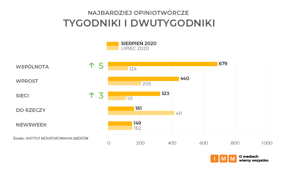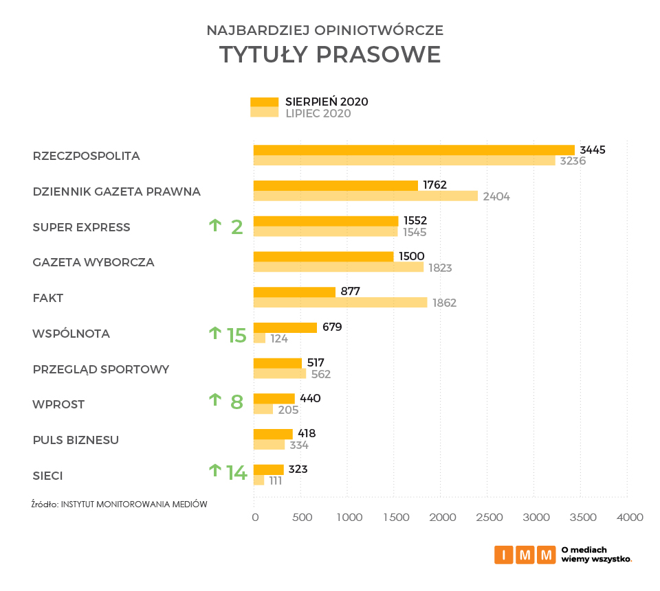 Miejsce pierwsze i drugie w kategorii najbardziej opiniotwórczych tytułów prasowych, podobnie jak w ubiegłym miesiącu, zajęły kolejno tytuły Rzeczpospolita – cytowana ponad 3,4 tys. razy i Dziennik Gazeta Prawna z wynikiem 1,7 tys. powołań. Podium zamyka natomiast Super Express, którego pozycja wzrosła o dwa miejsca względem lipca br. między innymi dzięki donosom redakcji, iż ówczesny minister zdrowia Łukasz Szumowski wakacje spędzał na hiszpańskiej wyspie Fuerteventura (Wyspy Kanaryjskie). Wzrost aż o piętnaście pozycji w stosunku do ubiegłego miesiąca zanotował dwutygodnik Wspólnota (679 wycinków), na który w związku z publikacją rankingu zamożności polskich samorządów za rok 2019 powoływano się setki razy. Tygodnik Wprost na miejscu ósmym z wynikiem 440 cytowań (ponad dwa razy więcej niż w lipcu br.) między innymi za sprawą wywiadu z Prezydentem Andrzejem Dudą, w którym wspominano temat emerytur stażowych. Największy zaś wzrost w tej kategorii dotyczy tygodnika Sieci, który w sierpniu opublikował wywiad z premierem Matuszem Morawieckim m.in. na temat kryzysu gospodarczego wywołanego pandemią.