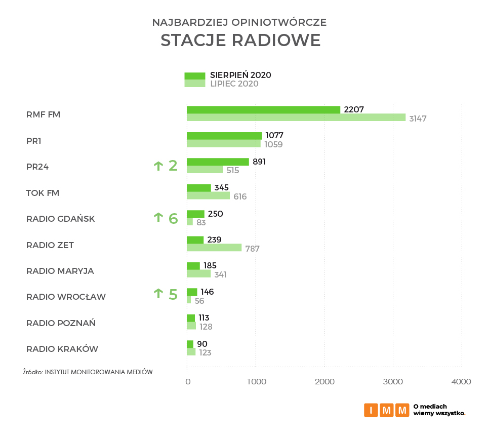 W rankingu najbardziej opiniotwórczych stacji radiowych pierwsze miejsce stale od początku roku zajmuje stacja RMF FM, którą w styczniu cytowano 2,2 tys. razy. Na miejscu drugim, podobnie jak w ubiegłym miesiącu, znalazł się Program I Polskiego Radia z wynikiem ponad 1 tys. powołań. Czołówkę zamyka natomiast Polskie Radio 24 cytowane w sierpniu 891 razy. Znaczące wzrosty zanotowało zarówno Radio Gdańsk, w którym prezes PKN Orlen Daniel Obajtek udzielał wywiadu na temat przejęcia przez koncern Grupy Lotos, jak i Radio Wrocław, w którym gościem był premier Mateusz Morawiecki.
