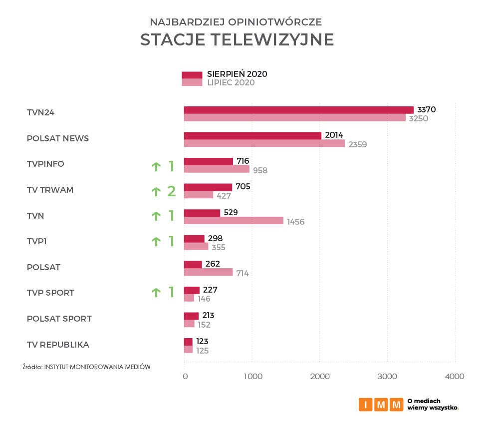 Tytuł najbardziej opiniotwórczej stacji telewizyjnej w sierpniu, niezmiennie od początku roku 2020, zajmuje stacja TVN24 z wynikiem ponad 3,3 tys. cytowań. Na miejscu drugim znalazł się Polsat News, który na podium także utrzymuje się już od stycznia br., a za nim TVPinfo z wynikiem 716 wzmianek. O dwie pozycje w stosunku do lipca br. podniosła się też w rankingu TV Trwam.