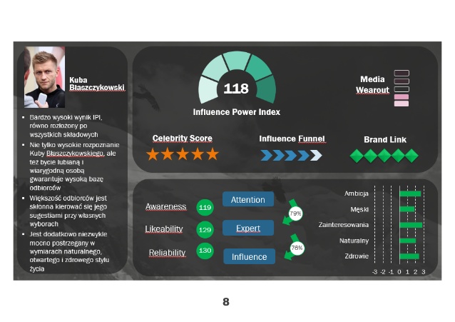 Zwycięzca rankingu – Kuba Błaszczykowski – minimalnie ustępuje Robertowi Lewandowskiemu pod względem rozpoznawalności, jednak zdecydowanie wygrywa na poziomie Sympatii i Wiarygodności. Jest też postrzegany jako ekspert, większość osób deklaruje, że jest skłonna sugerować się jego sugestiami przy swoich wyborach.
