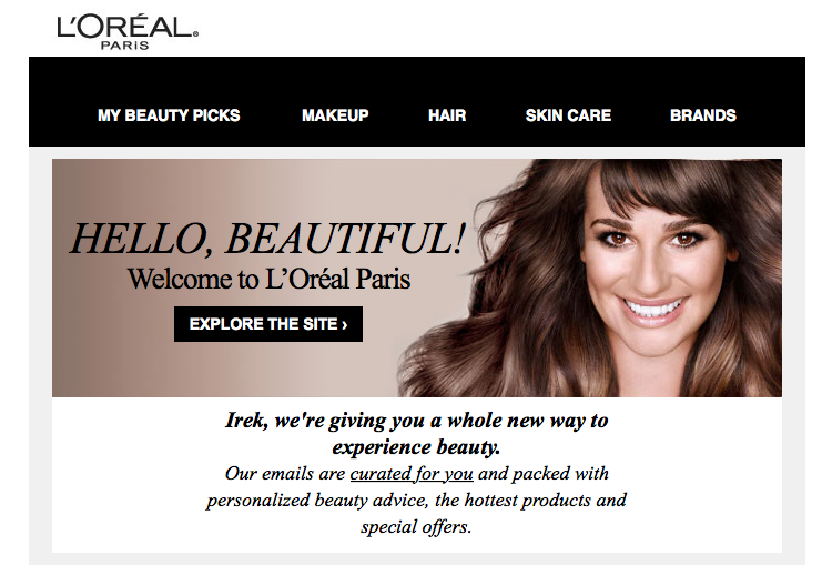 Fragment wiadomości powitalnej od L’Oreal Paris. Powitanie zapowiada starannie wyselekcjonowane treści dopasowane do odbiorcy w dalszej komunikacji.
