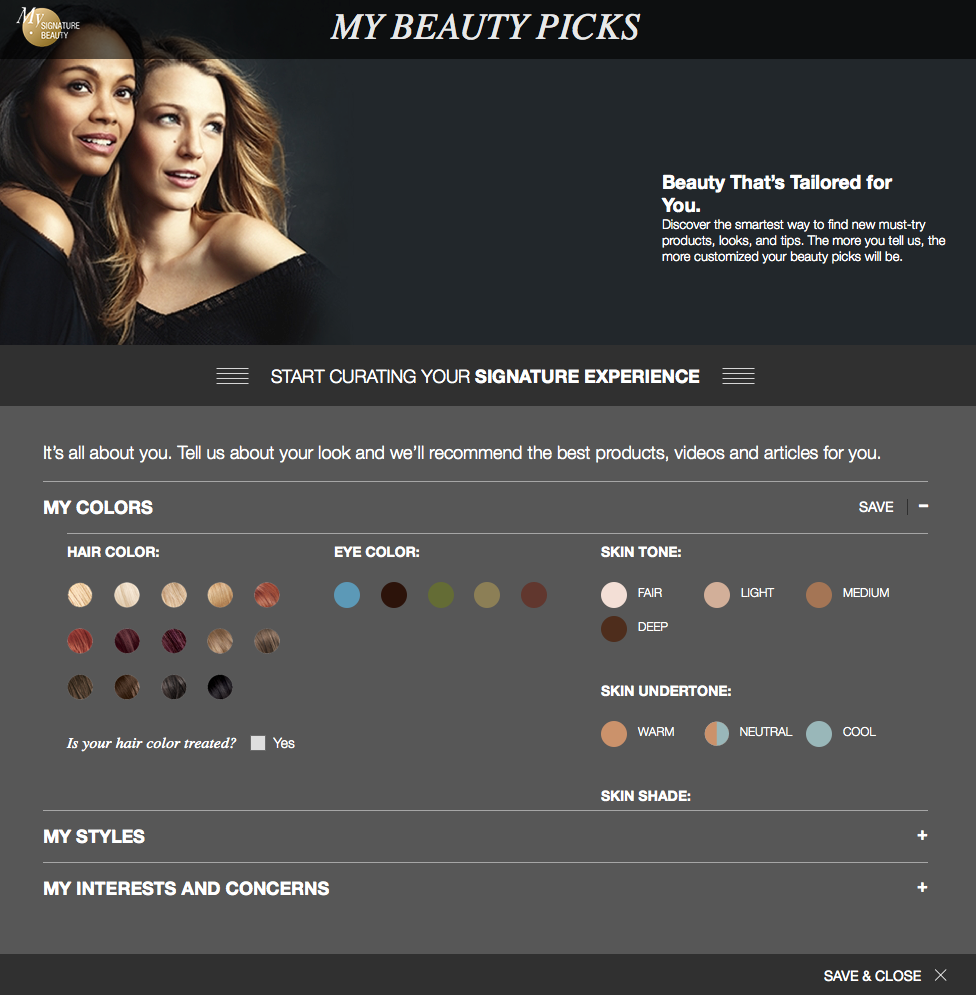 Centrum preferencji L’Oreal Paris. Spośród podanych opcji odbiorca może szybko wybrać swój typ urody, określić swój ulubiony styl oraz wybrać tematykę, która go najbardziej interesuje.