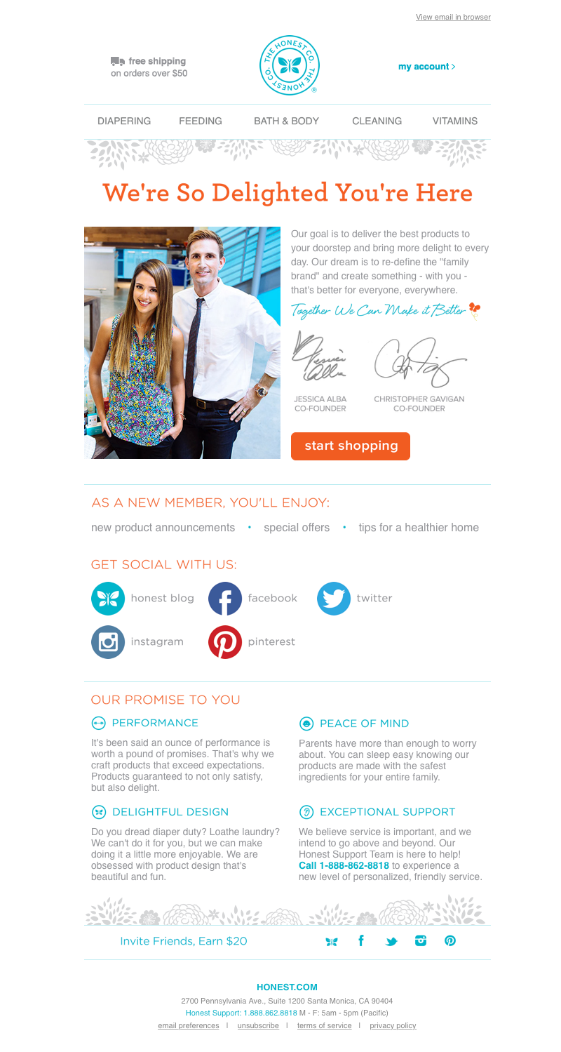 Wiadomość powitalna od The Honest Company zawiera podziękowania od założycieli, informacje dotyczące wysyłanych w przyszłości treści, przyciski udostępnień w mediach społecznościowych, a nawet link do programu lojalnościowego.