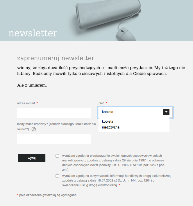 Pola wymagające udzielenia zgody na przetwarzanie danych osobowych oraz przesyłanie materiałów marketingowych są prawnie wymagane i powinny znajdować się w formularzu subskrypcji.