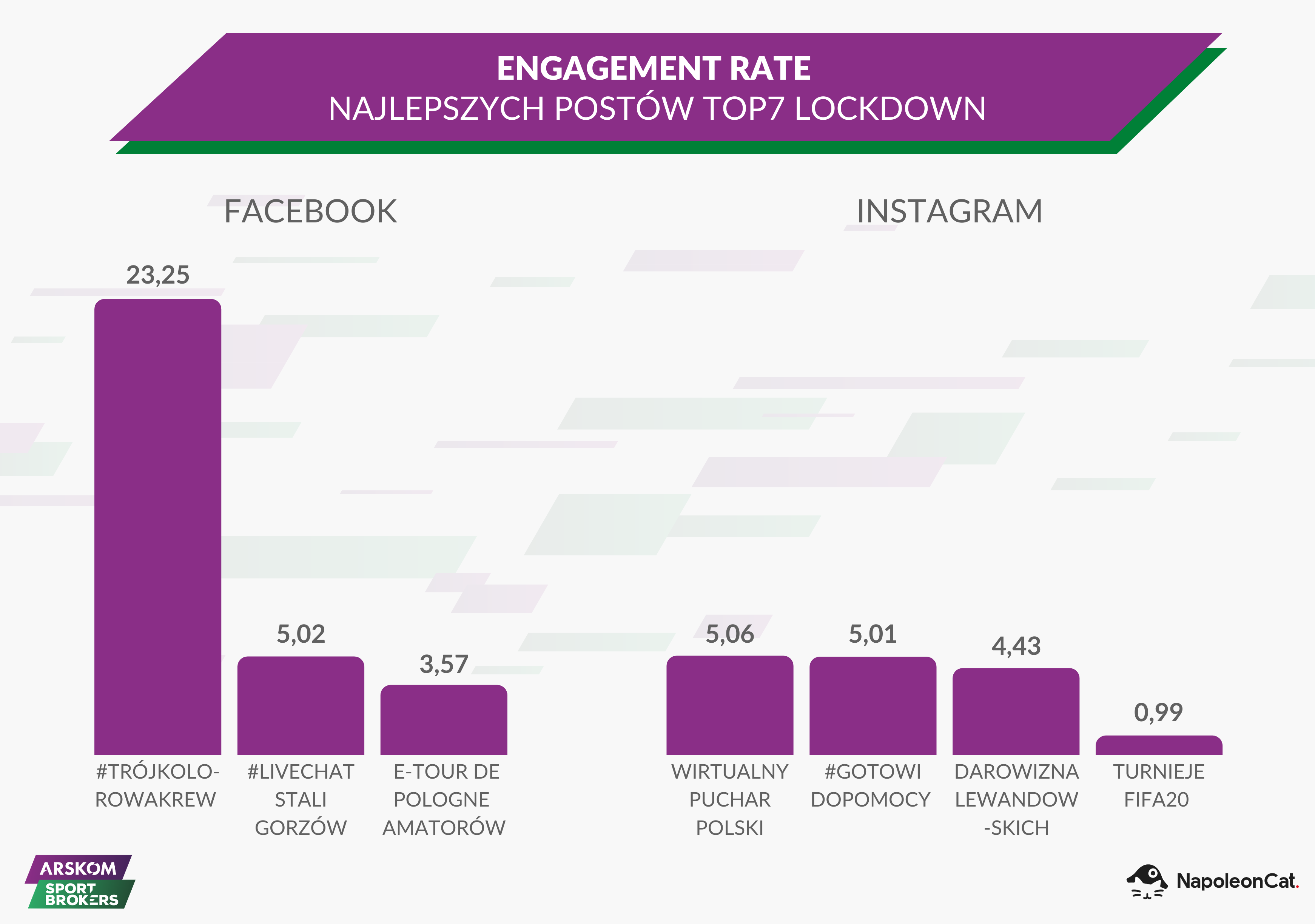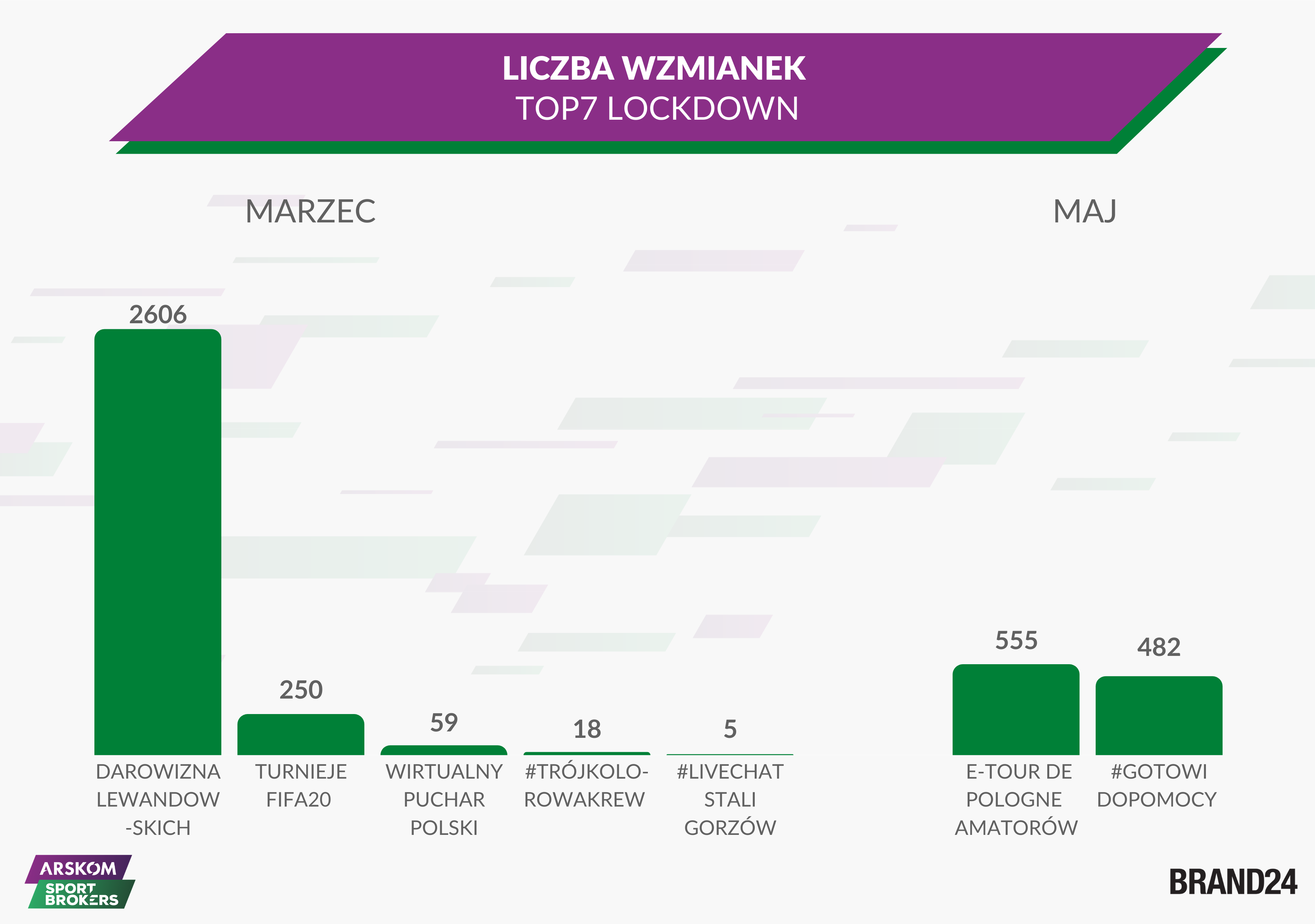 W badaniu skupiliśmy się na przeglądzie akcji z krajowego podwórka tych organizacji, które są cenione i popularne wśród polskich kibiców m.in. ze względu na osiągane wyniki sportowe z ostatnich lat. Są to m.in. kluby, sportowcy, ale też organizatorzy lig i imprez sportowych. W rankingu uwzględniliśmy 7 akcji, które odbyły się w czasie lockdownu w Polsce (marzec-czerwiec 2020 r.), a o ich miejscu decydował wskaźnik Engagement Rate (ER) i liczba wzmianek w internecie. Kolejność wymienionych w dalszej części tekstu akcji jest zgodna z kolejnością pierwszego wskaźnika, drugi stanowił rolę pomocniczą do wyboru najlepszych akcji.