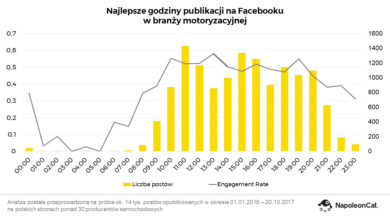 Zestawienie przedstawia, kiedy najczęściej pojawiają się nowe posty na stronach producentów, a kiedy miłośnicy czterech kółek najchętniej angażują się w te treści. Przenalizowanych zostało prawie 14 tysięcy postów opublikowanych przez lokalne strony oraz ponad 30 marek motoryzacyjnych w okresie 1.01.2016 – 20.10.2017, co daje nam prawie dwa lata.