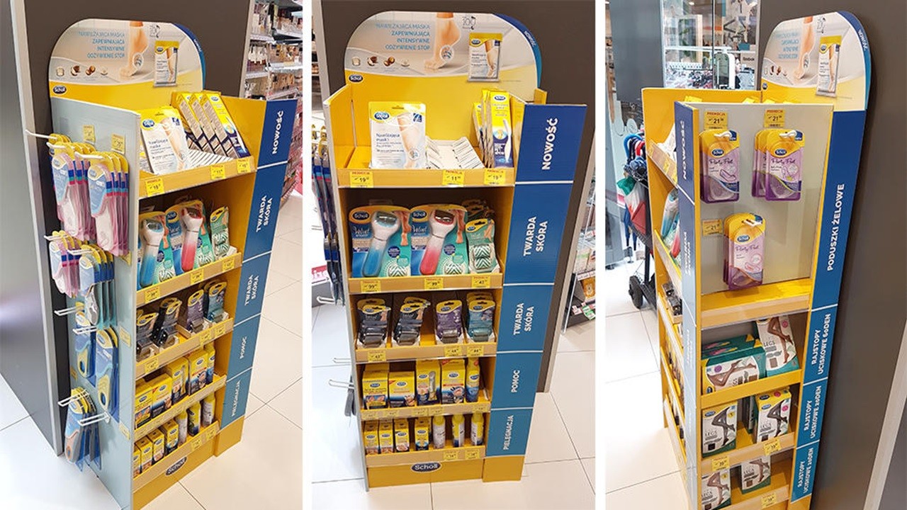 Ten display Scholl to przykład tego w jak świetny sposób można sobie poradzić z dużą ilością różnorodnego asortymentu na ekspozycji. Jak go w sposób sensowny wyeksponować, a co ważniejsze – zakomunikować do klienta. I to wszystko tylko w „skromnym” formacie ćwierćpalety!