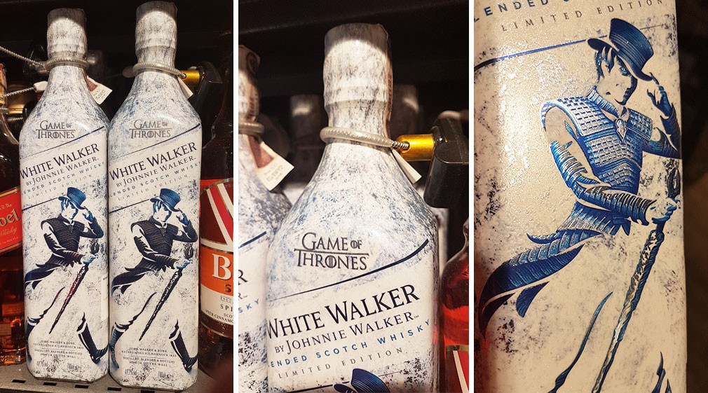 Sleeve na limitowanej edycji Johnnie Walker. Butelkę tę wrzuciłem jeszcze przed emisją niesławnego ósmego sezonu GOT. Nie było wtedy wiadomo, jaką będzie on porażką! Wszyscy w napięciu oczekiwali premiery. A tu, znacznie wcześniej, na rynek sklepowy trafia taki produkt – grzech nie kupić. Nie dość, że technologicznie perełka (ilość lakierów ozdobnych, metalizowanych farb itd.) to także kreatywnie i graficznie – majstersztyk. Generyczna nazwa produktu i marki subtelnie zmieniona na „White Walker” (fani GOT łapią w mig, o co chodzi). Także główny brand hero wystylizowany na Białego Wędrowca. Całościowo projekt opakowania naprawdę na najwyższym poziomie (zarówno koncept, jak i egzekucja). I chyba pomysł z limitowanymi edycjami musiał chwycić sprzedażowo, bo obecnie na rynku mamy kolejne dwie butelki tej marki nawiązujące do świata wymyślonego przez Georga R. R. Martina. (Ze względu na wysoką cenę nadal waham się, czy je kupić – oczywiście do celów kolekcjonerskich :_)