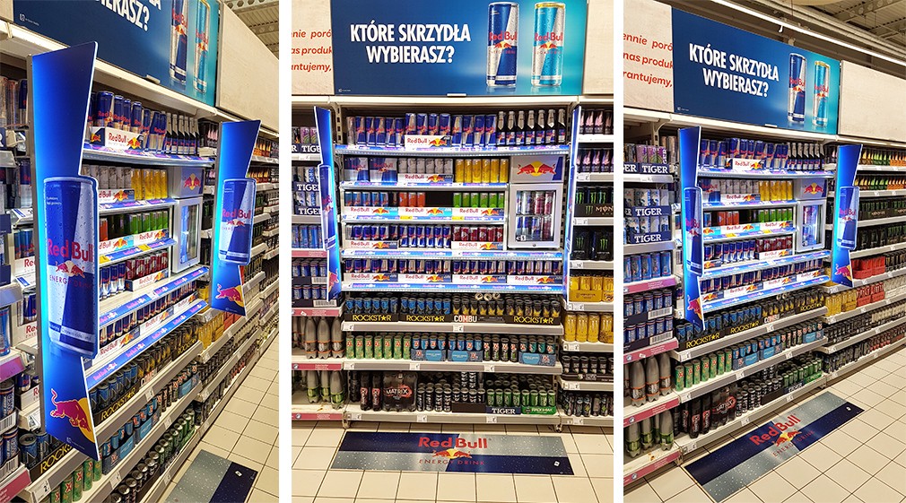 Oznakowanie półki Red Bull w sklepie Carrefour. To jedna z pierwszych na rynku konstrukcji wykorzystująca elementy podświetlane z tworzywa rastrowego. Dzięki zastosowaniu tego surowca stopery podświetlone tylko po jednej krawędzi świecą całą płaszczyzną grafiki. To bardzo efektowne rozwiązanie. Całość uzupełniają podświetlone listwy cenowe, branding na toperze regału oraz naklejka podłogowa. I pomimo tego, że Red Bull zajmuje dopiero drugie miejsce pod względem sprzedaży w tej kategorii – klienci widząc takie oznakowanie, mogą odnieść zupełnie inne wrażenie :_)