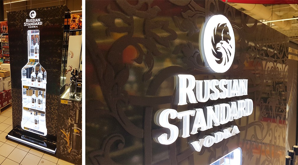 „Carski” wręcz przepych bije z tej konstrukcji wódki Russian Standard. Świetnie wycięty, w ciemnym tle, kontur butelki. Dodatkowe wzmocnienie głębi przestrzeni półkowej poprzez lustrzaną plexi. Jubilerskie wręcz zdobienia. Wszystko to razem daje wrażenie ekskluzywności – a o to przecież w tej zabawie chodzi.