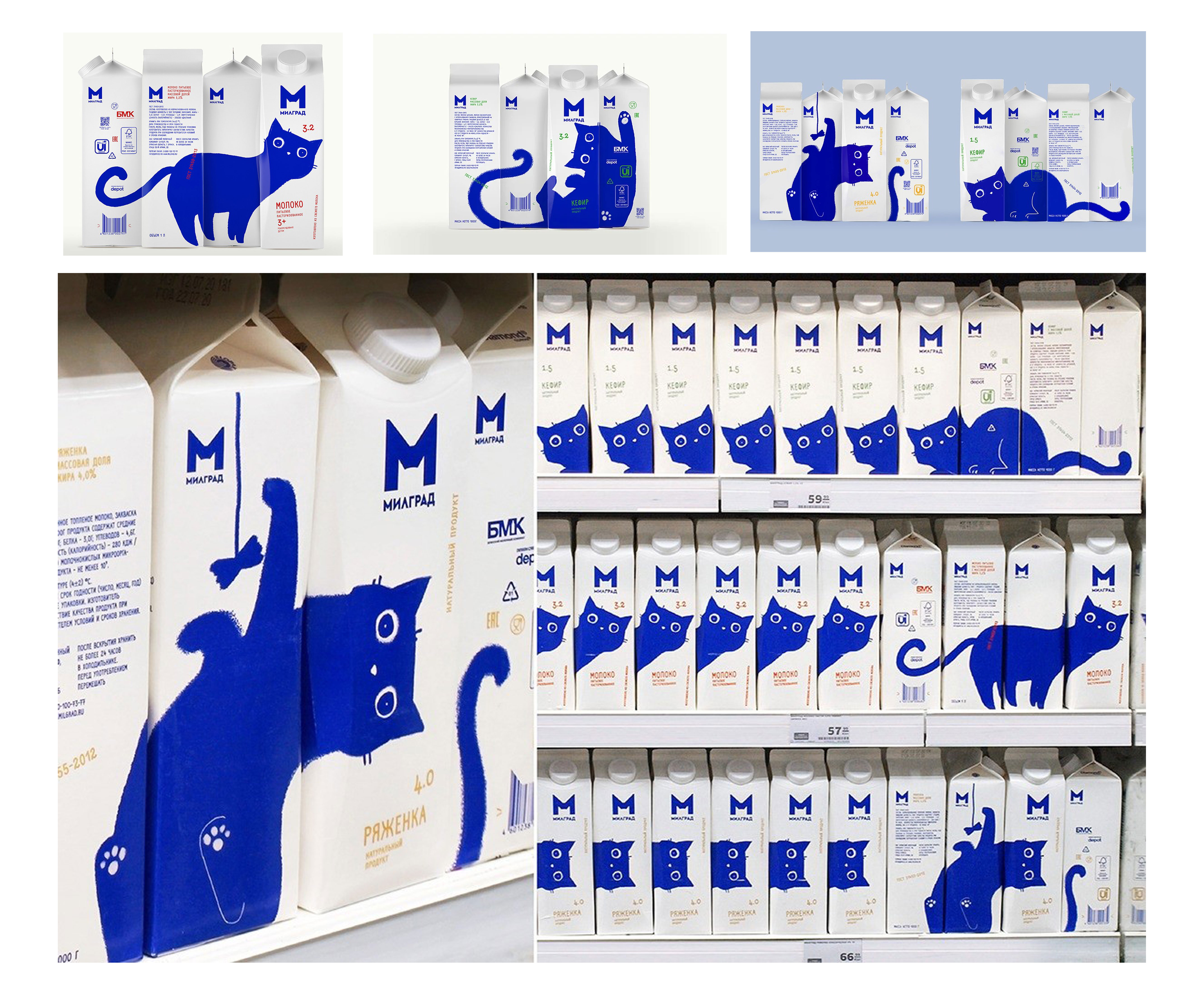 A tak na poważnie, to poniższa seria opakowań, oprócz fantastycznego pomysłu na grafikę jest genialnym przykładem analizy półki sklepowej. Przecież mleka na półkach rzadko stoją w pojedynczych face’ach. Więc jest to wymarzone rozwiązanie dla koncepcji ekspozycji kliku produktów obok siebie. Oczywiście efekt na półce jest w dużej mierze zależny od teamu merchandiserów. 🙂