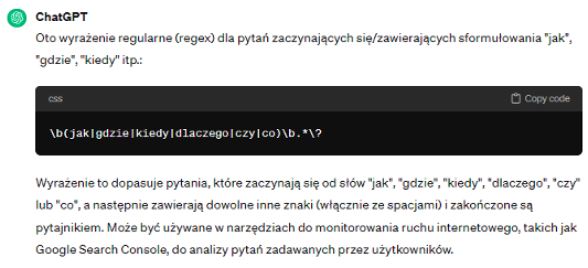 Kolejnym skutecznym promptem, który możemy zastosować, jest skierowanie zapytania o stworzenie wyrażeń regularnych do zastosowania w Google Search Console. Wyrażenia regularne (ang. regular expressions), nazywane skrótowo regex lub regexp, są stosowane w różnych językach programowania. Mają swoje zastosowanie także w SEO – pozwalają na zaawansowane analizowanie i filtrowanie danych w narzędziach Google, wyszukiwanie duplikatów treści, identyfikowanie błędów wewnętrznych czy tworzenie reguł przekierowań. Wpisując poniższy prompt do ChataGPT, otrzymamy zwrotnie gotowe do użycia w Google Search Console wyrażenie regularne.