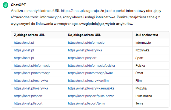 ChatGPT pomoże w przeanalizowaniu semantyki adresu URL, która bezpośrednio odnosi się do treści zawartej na danej podstronie. Analiza semantyki adresu URL umożliwi sztucznej inteligencji zrozumienie zawartości strony internetowej, wykonanie kategoryzacji treści, a także zaproponowanie osadzenia linków wewnętrznych i zewnętrznych wraz z optymalizacją SEO. Poniższy prompt ChataGPT pozwoli wygenerować tabelę ze wskazaniem przebiegu linkowań oraz oznaczeniem konkretnego anchora.