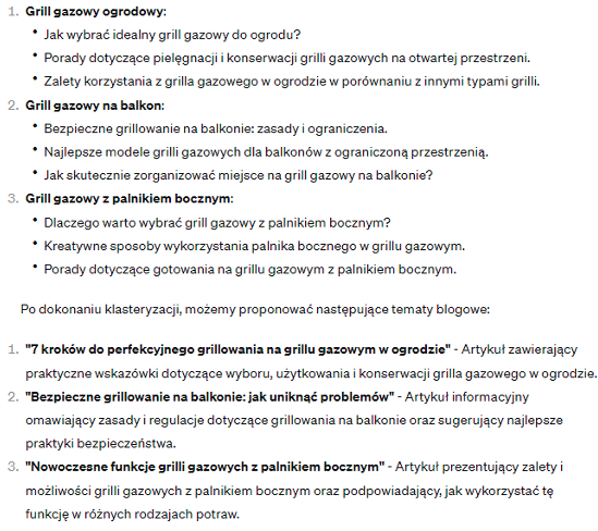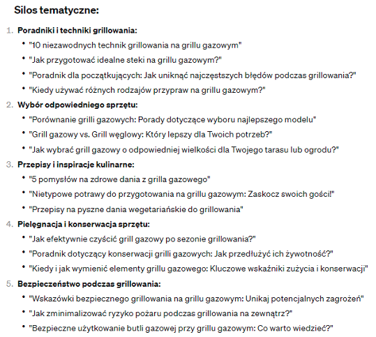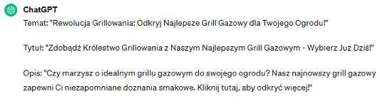 Powyższy prompt pozwoli uzyskać następujące wyniki dla przykładowej frazy grill gazowy: