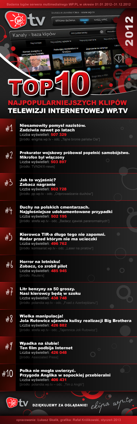 10 najpopularniejszych klipów WP.TV w 2012 roku osiągnęło łącznie 4,7 miliona odtworzeń. Ranking otwiera materiał z serii Enigma. W pierwszej dziesiątce nie zabrakło też klipów z innych autorskich produkcji WP.TV, w tym m.in. Polandii, która opowiada o życiu obcokrajowców w Polsce. Co ciekawe, w TOP 10 znalazły się tylko 3 materiały „zewnętrzne”, których źródłem są m.in. agencje prasowe. Klip TVN24/X-news uplasował się na wysokiej 2 pozycji, Reutersa na 6, natomiast Associated Press na 9.