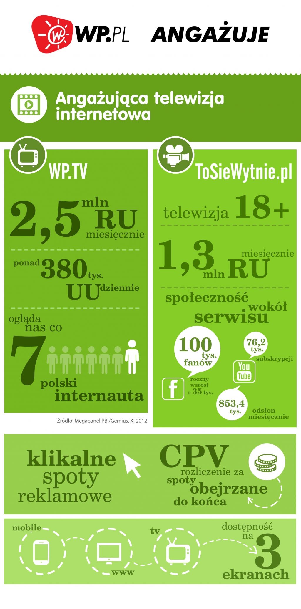 WP.TV w 2012 roku odwiedzało miesięcznie średnio 2,7 mln realnych użytkowników (źródło: Megapannel PBI/Gemius, styczeń-październik 2012), czyniąc ją najpopularniejszą telewizją internetową w Polsce. Serwis ofertuje kontent rozrywkowo-informacyjny. Dominują w nim krótkie materiały wideo. Przykładowo, treści agencyjne to średnio 1-3 min., wywiady z gwiazdami polskiego show biznesu 2-5 min., a produkcje autorskie maksymalnie do 10-12 min. Produkcje WP.TV nie raz były wyróżniane w kraju i zagranicą – m.in. w międzynarodowym konkursie projektów internetowych W3Awards organizowanym przez International Academy of the Visual Arts z siedzibą w Los Angeles.