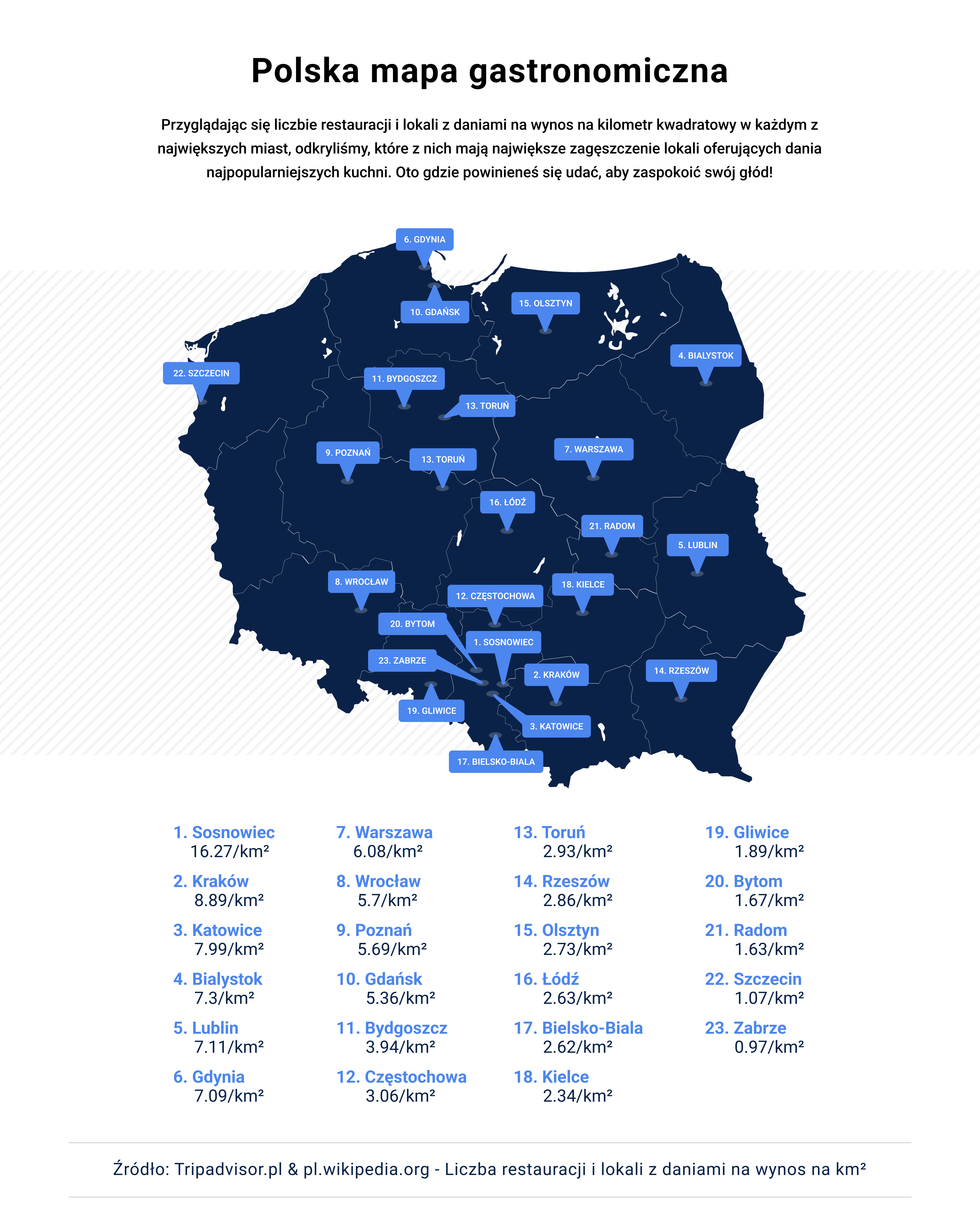 Sosnowiec to bezkonkurencyjna gastronomiczna stolica Polski, dzięki największej liczbie restauracji i lokali z daniami na wynos na km2. Pomimo swojej niewielkiej powierzchni (91,6 km2) w porównaniu ze stolicą, Warszawą (517,2 km2), Sosnowiec stał się liderem rankingu z ponad 16 lokalami przypadającymi na każdy kilometr kwadratowy – to prawie dwa razy więcej niż w przypadku wicemistrza, Krakowa. Niezależnie od tego, czy chodzi o trzy ulubione typy kuchni – europejską, polską i włoską – czy też o bardziej odważne wschodnioazjatyckie dania na wynos, to niewielkie miasto ma wiele opcji dla polskich smakoszy.