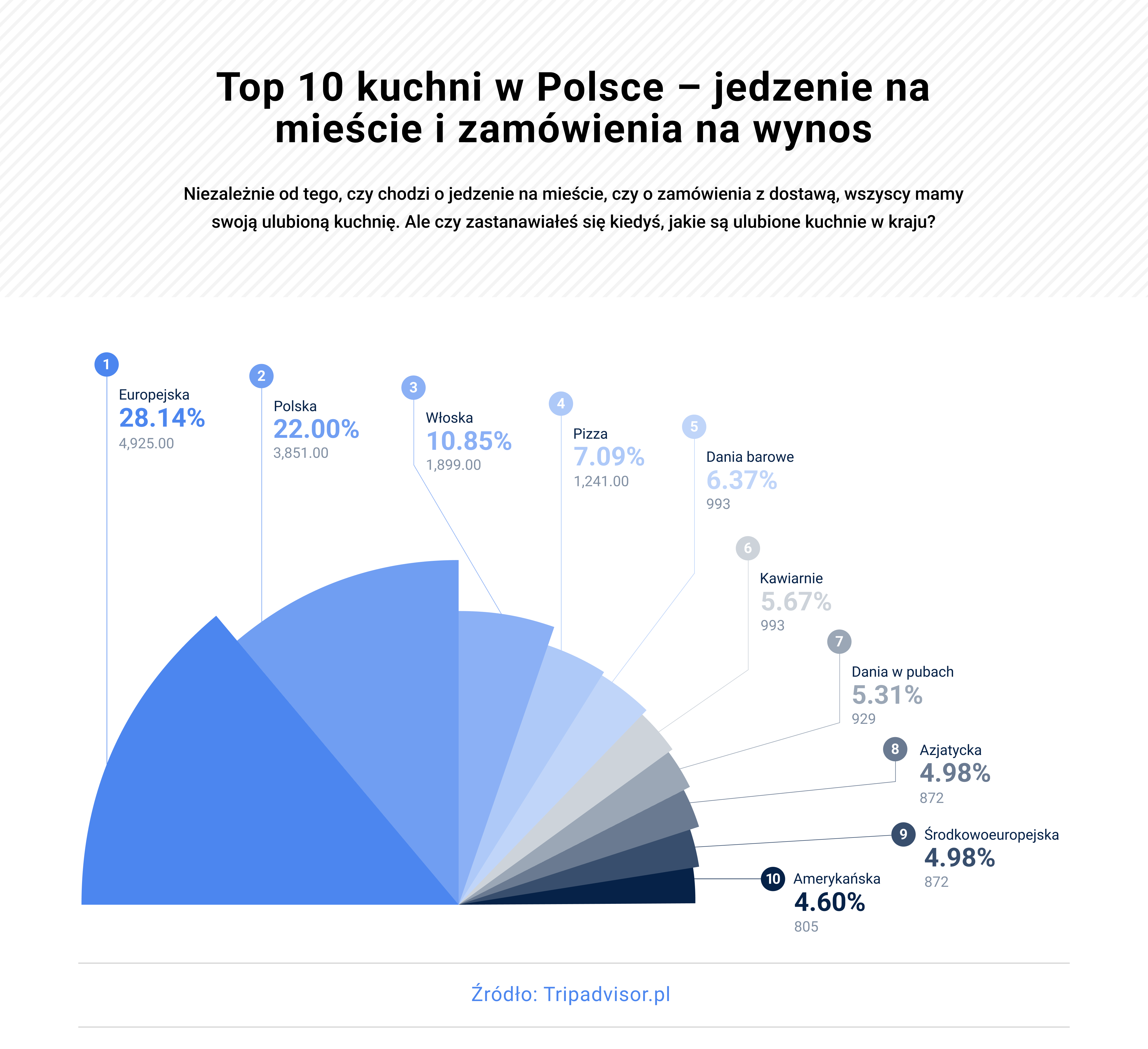 Według nowych danych Polacy preferują dania pochodzące z bliższych regionów, zarówno przy zamawianiu dań na wynos, jak również jedząc na mieście, przy czym kuchnie polska, europejska i środkowoeuropejska stanowią ponad połowę (55%) pierwszej dziesiątki najpopularniejszych kuchni. Zamiłowanie do kuchni włoskiej i jej popularność są w Polsce nadal bardzo duże, a kuchnia włoska i pizza stanowią blisko jedną piątą (17,9%) pierwszej dziesiątki rankingu.