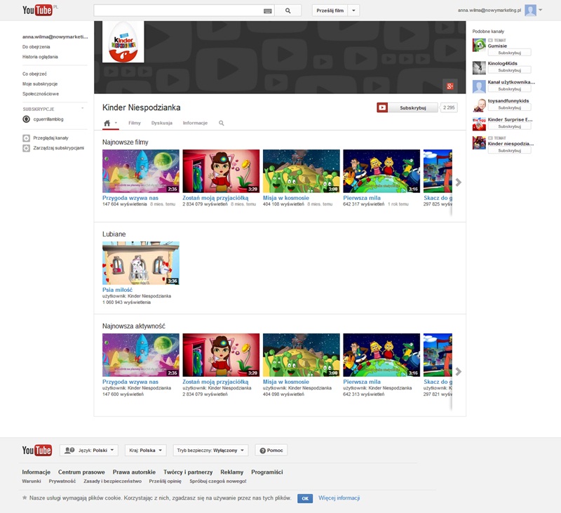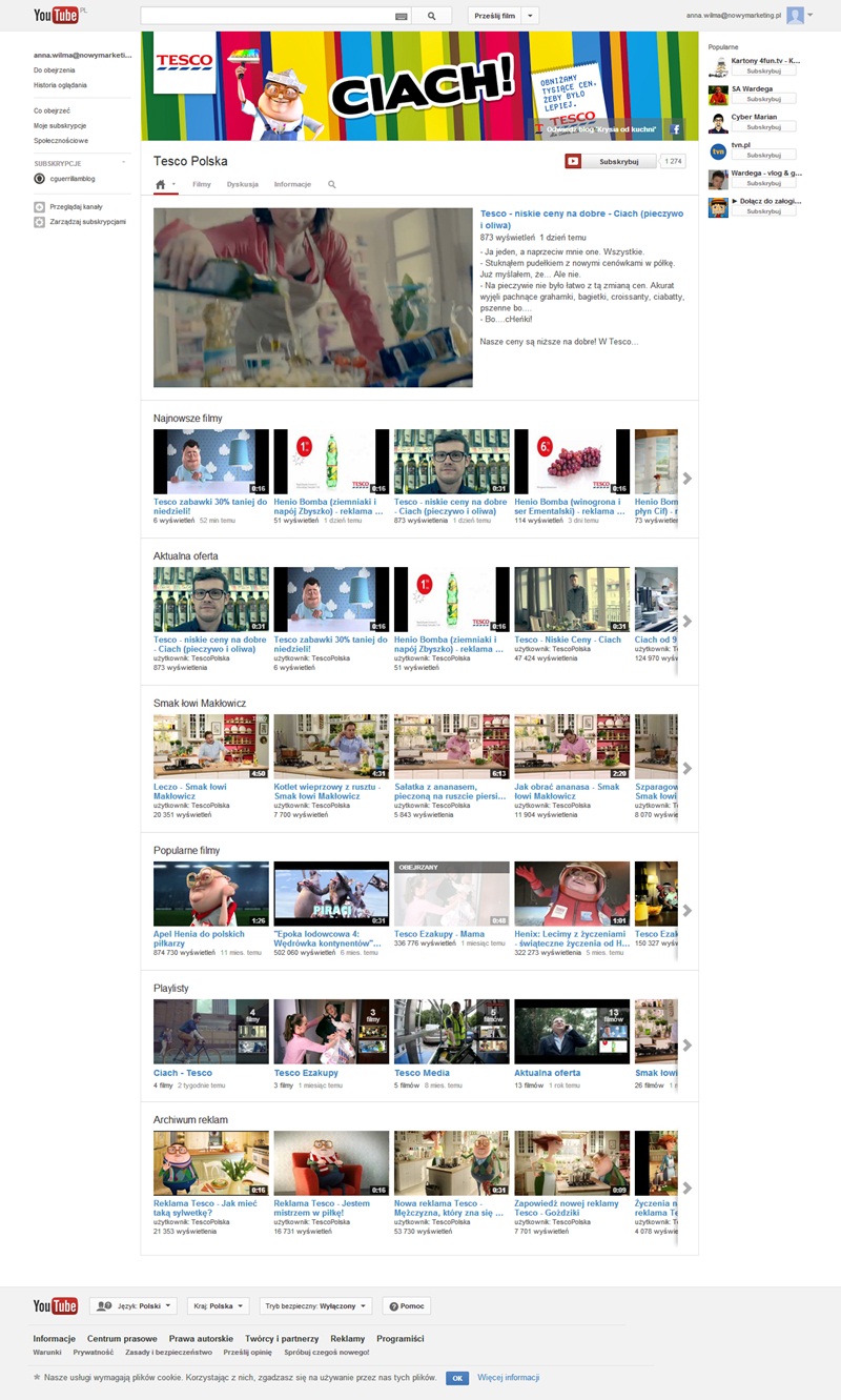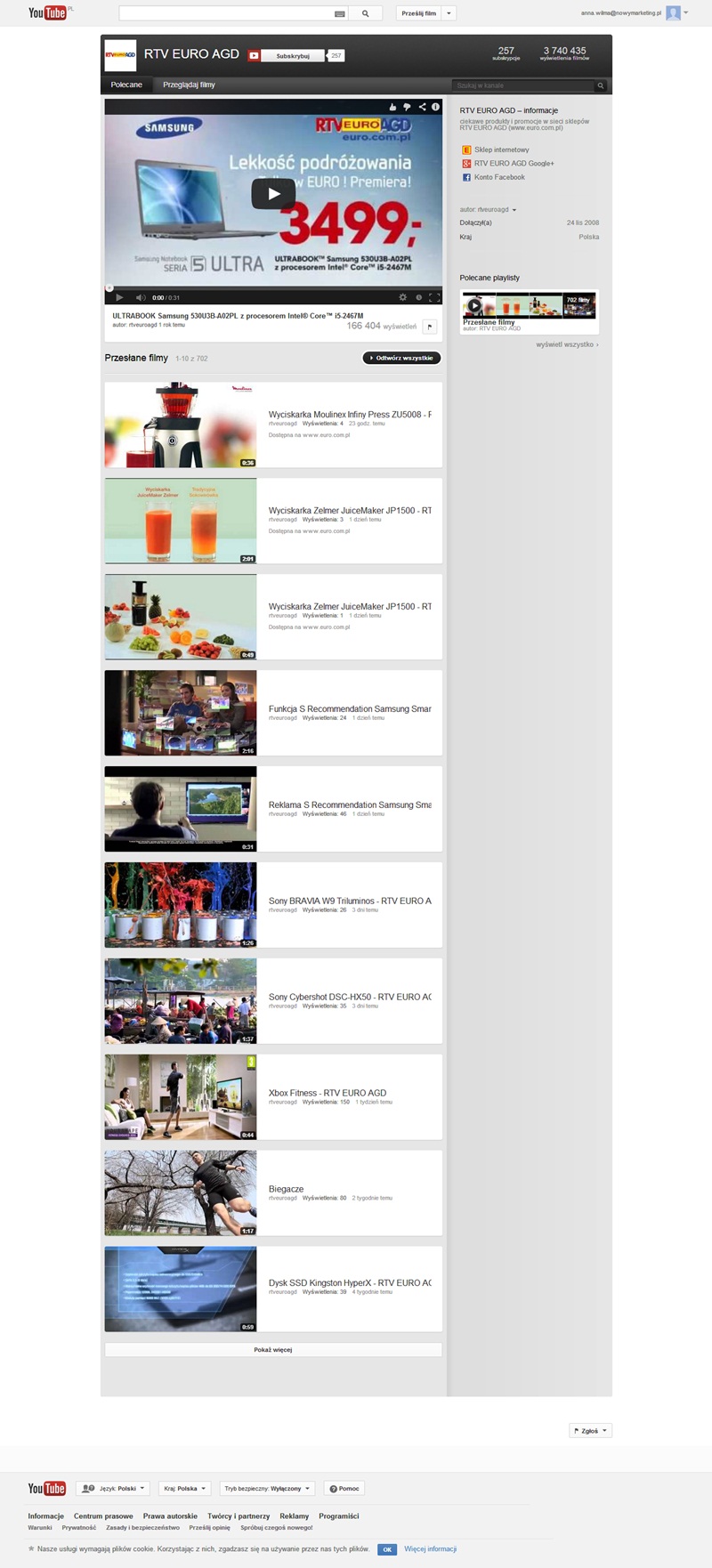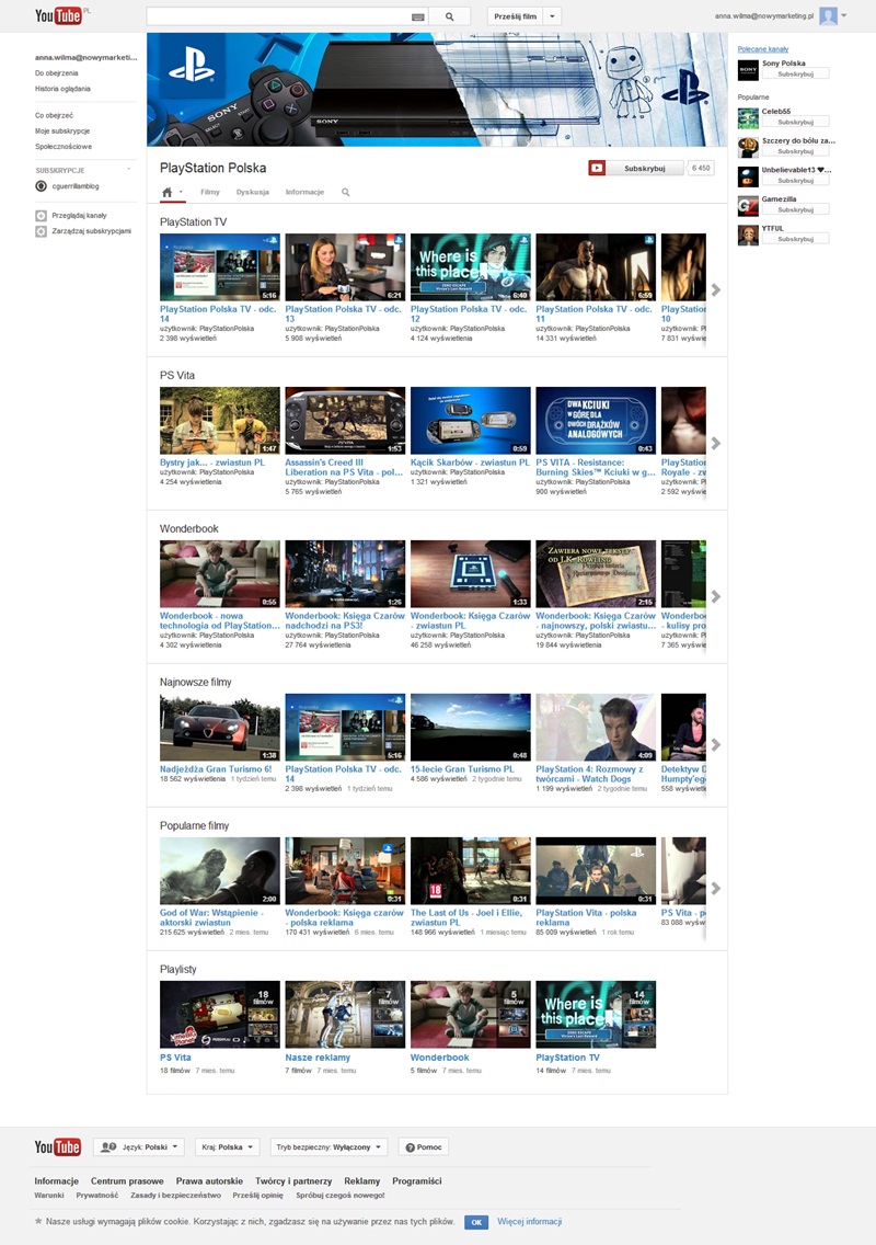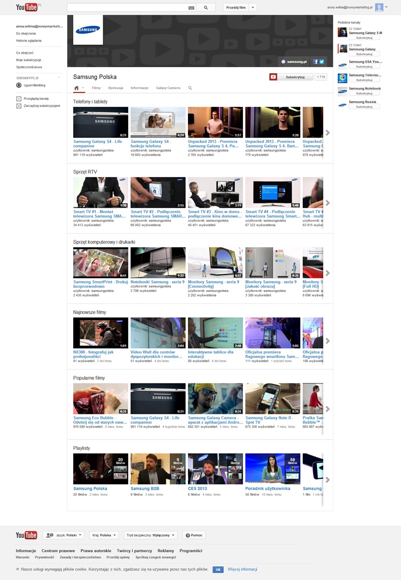Filmy opublikowane na kanale Electronic Arts Polska obejrzało ponad 25 mln razy, Serce i Rozum ponad 20 mln razy, a Samsung Polska prawie 14 mln razy. W czołówce znalazły się także kanały: Leroy Merlin Polska (8,7 mln obejrzeń), PlayTV (8,6), Nokia Poland (8,5), Co dziś na obiad (7,8), ING Bank Śląski (7,5), TMobileTrendyPL (7,2), NIVEA Polska (5,5), ŠKODA Polska (5,3), MojeCiasto (5,2), LIDL Polska ( 4,5), Old Spice Polska (4,5), PLUS (4,4), E. Wedel (4,5), Szkoła Gotowania WINIARY (4,2), Dove Polska (4), RTV Euro AGD (3,7) i Bank Millennium (3,5).