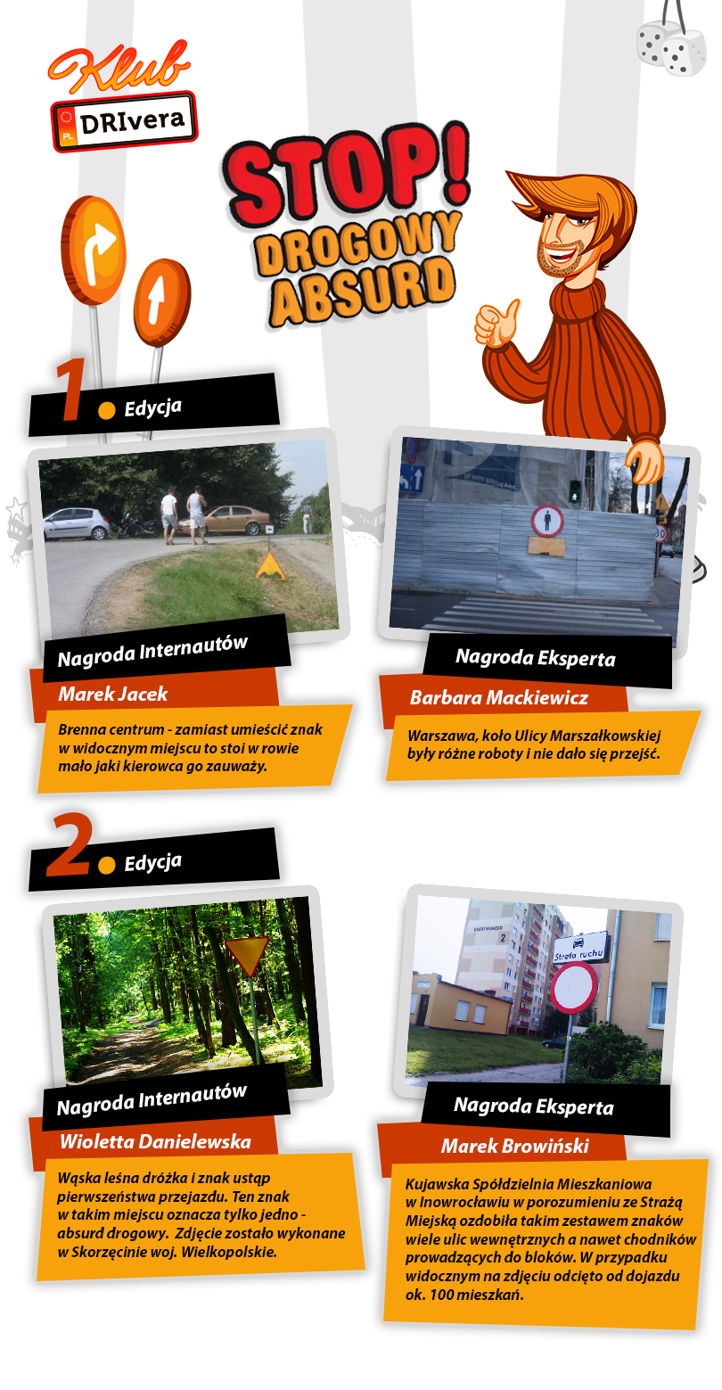 Lista zwycięzców obu edycji akcji „Stop! Drogowy absurd” oraz wyróżnione przez eksperta i internautów zdjęcia udostępnione są na profilu Klubu DRIvera na Facebooku www.facebook.com/klubdrivera