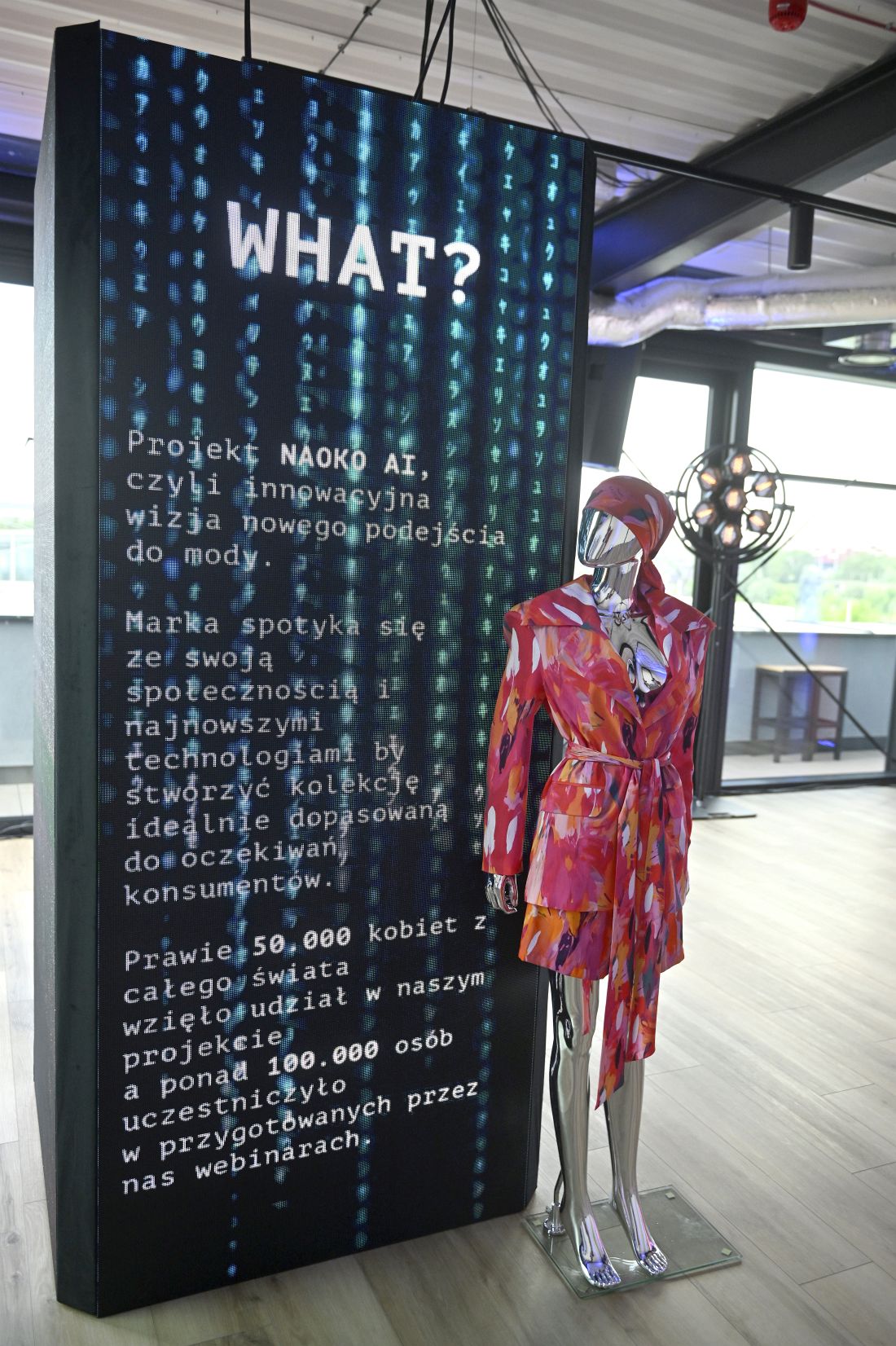 Materiały wizualne powstałe w wyniku połączenia materiałów wideo obrobionych w najnowocześniejszych narzędziach AI zapełniały przestrzeń i pozwalały zapoznać się z projektem marki. Pokaz w formie filmu został wyświetlony dla wszystkich odwiedzających i był kulminacyjnym elementem wydarzenia. W trakcie całego wydarzenia NAOKO pozwoliło swoim gościom poznać osiągnięcia sztucznej inteligencji i przetestować niespotykane rozwiązanie takie jak rozmowę z awatarem NAOKO GIRL, która zaskakiwała zgromadzonych swoją wiedzą na temat najnowszej kolekcji. Marka zadbała o atrakcje na najwyższym poziomie, oferując jedyny w swoim rodzaju NAOKO VR EXPERIENCE, dzięki któremu NAOKO.AI była na wyciągnięcie ręki. Ostatnią z atrakcji, jaką marka przygotował dla zaproszonych był NAOKO FASHION MAPING 3D, statyczna projekcja składająca się z elementów kolekcji, tworząca immersyjne doświadczenie.