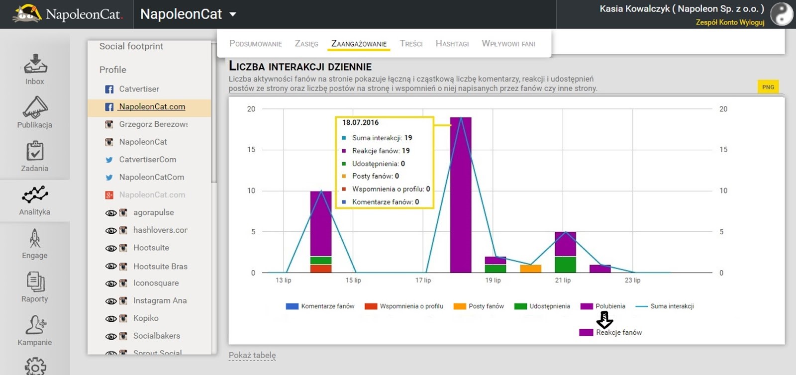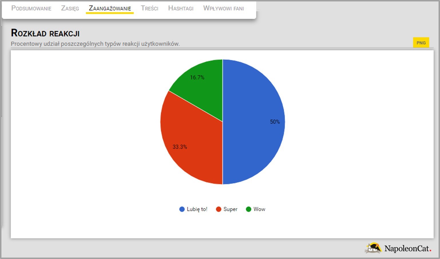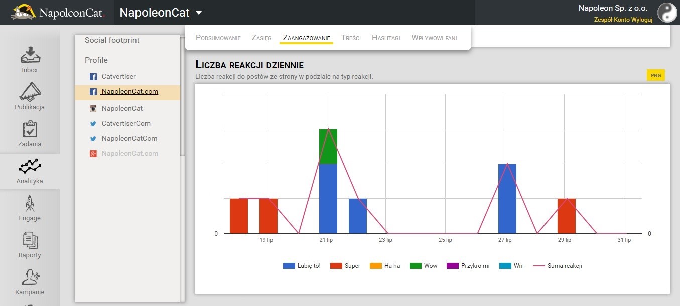 Nowa funkcja NapoleonCat pokazuje zarówno sumę, jak i liczbę poszczególnych reakcji na profilach. Użytkownicy mogą zatem sprawdzać, ile ich posty zdobyły polubień, serduszek, zachwytów czy oznak niezadowolenia. Wprowadzona zmiana dotyczy postów publikowanych po 31 lipca 2016r. Wszystkie wcześniejsze posty zawierają wyłącznie dane dotyczące polubień.