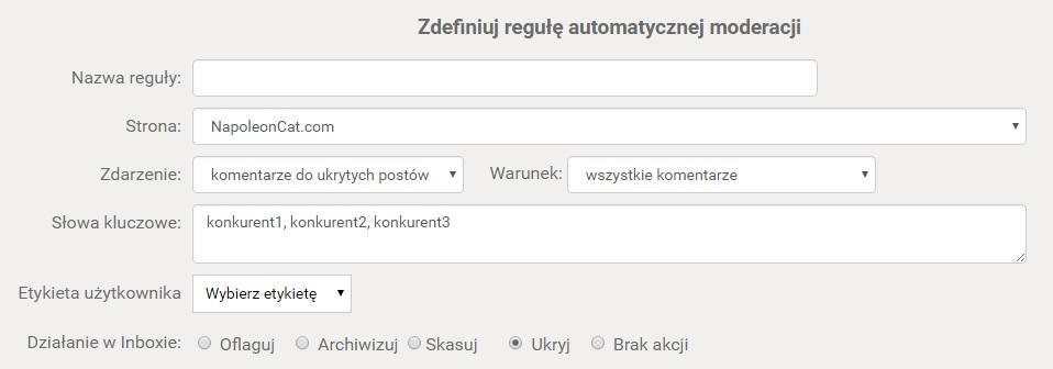 Nowa opcja na platformie NapoleonCat umożliwia definiowanie konkretnych działań do postów na stronie, komentarzy, prywatnych wiadomości oraz komentarzy do ukrytych postów na Facebooku. NapoleonCat może publikować odpowiedzi, przesyłać e-mailem pytania użytkowników do odpowiednich osób w firmie, czy np. kasować spam z komentarzy. Platforma rozbudowała funkcję automoderacji o kolejne opcje. Teraz jej użytkownicy mają możliwość ukrycia wybranych treści – zarówno na podstawie rodzaju kontentu oraz słów kluczowych które zawiera lub tych od konkretnego, wcześniej zdefiniowanego użytkownika.