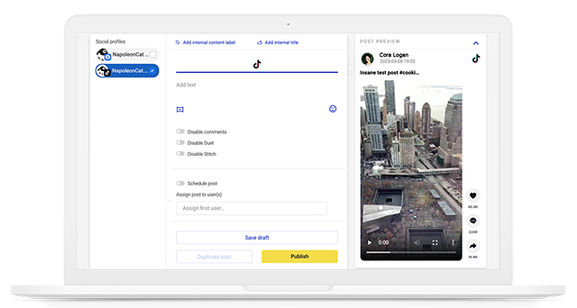 Dzięki możliwości zarządzania TikTokiem z tej samej platformy, za pomocą której publikujesz treści i odpowiadasz na komentarze z innych profili społecznościowych (np. Instagram, Facebook, czy LinkedIn), znacznie usprawnisz proces planowania treści i budowania zaangażowanej społeczności. A to właśnie te kwestie są kluczem do sukcesu na TikToku.