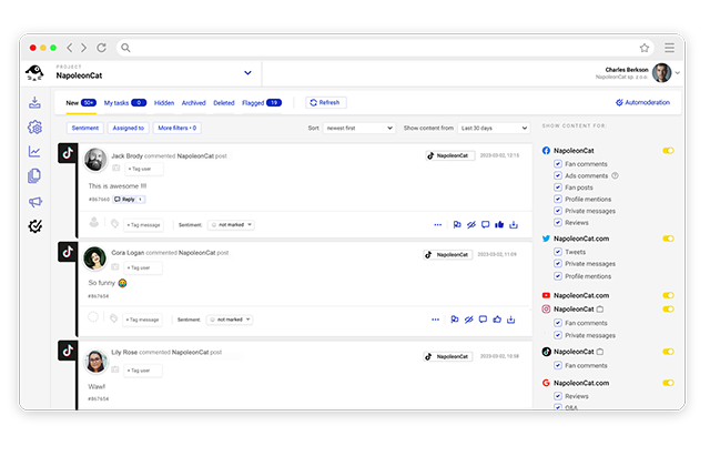 - Polubić, ukryć lub odpowiedzieć na komentarz z TikToka bezpośrednio z NapoleonCat, bez konieczności ponownego odblokowywania telefonu lub przełączania się między kontami, zakładkami i platformami społecznościowymi.