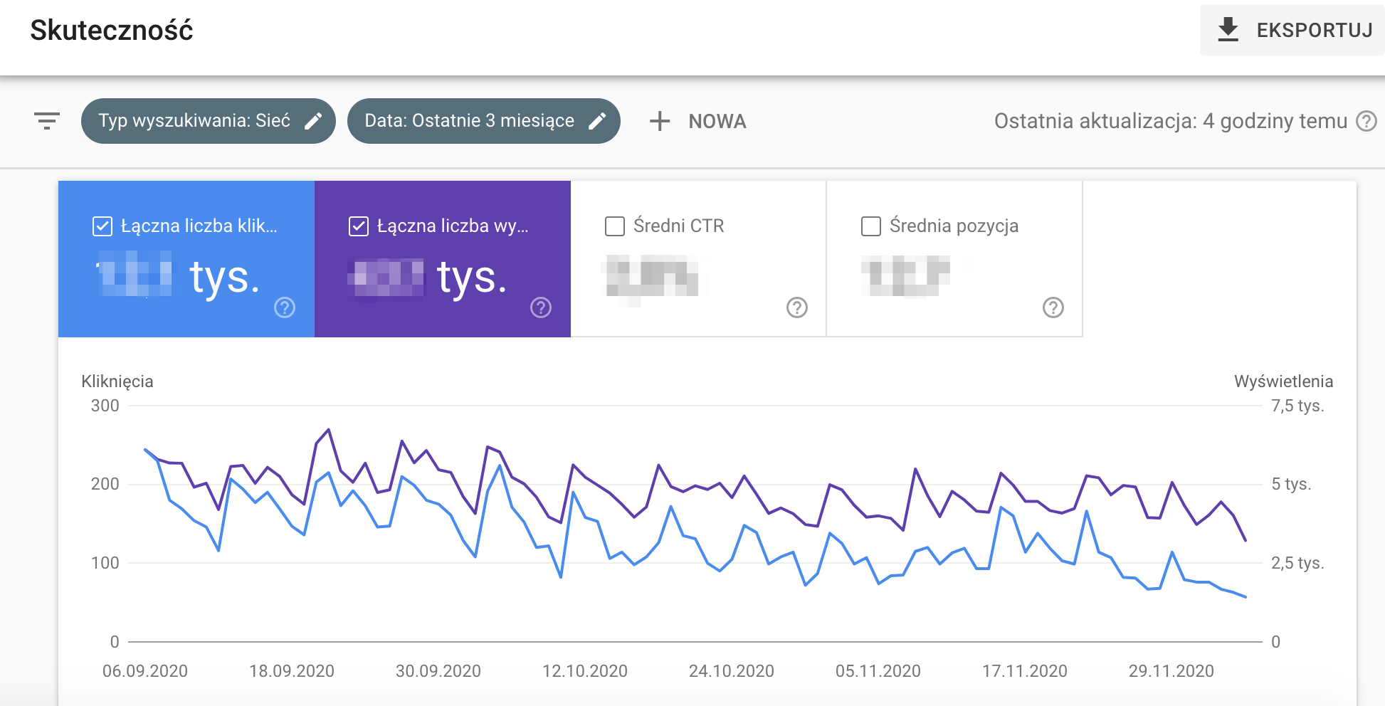 • Kliknięcia – te dane odzwierciedlają liczbę kliknięć w wyszukiwarce Google, które skutkują odwiedzeniem witryny przez użytkowników.