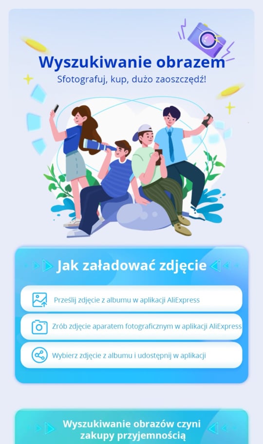 Platforma Aliexpress – słynąca z ogólnoświatowej sprzedaży ogromnej liczby produktów niemalże z każdej kategorii – również ułatwia konsumentom przedarcie się przez gąszcz ofert w poszukiwaniu konkretnego przedmiotu. Jak w przypadku pozostałych aplikacji – wyszukiwanie obrazem w mobilnej wersji sklepu daje możliwość szukania produktu przez zdjęcie wykonane smartfonem lub wgrane z pamięci urządzenia. Wyszukiwanie przez zdjęcie na stronie Aliexpress w przeglądarce internetowej wygląda jednak nieco inaczej. Użytkownik w pierwszej kolejności musi skorzystać z wyszukiwarki Google Grafika, gdzie wybiera opcję Wyszukiwanie obrazem. Po wgraniu zdjęcia interesującego produktu, należy w dymek z miniaturą zdjęcia wpisać kod: site:aliexpress.com, aby ręcznie zawęzić wyniki wyszukiwania wyłącznie do witryny sklepu Aliexpress.