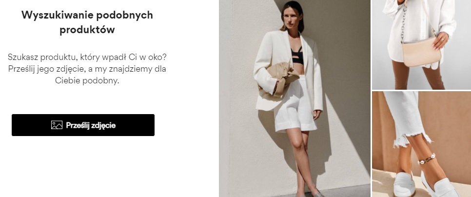 Wyszukiwanie wizualne coraz częściej wykorzystywane jest w e-commerce, w szczególności na rynkach zagranicznych. Google czy Pinterest mają do tego swoje dedykowane narzędzia (Google Lens i Pinterest Lens), których celem jest pomoc użytkownikom w znalezieniu w sieci produktów, czy inspiracji odpowiednich właśnie dla nich. Na rynku fashion z takich rozwiązań korzystają w swoich aplikacjach m.in. ZARA czy ASOS. Sprawne i dokładne wyszukiwanie jest kluczowe w takiej funkcjonalności. Standardem w tego typu rozwiązaniach jest możliwość skorzystania z aparatu w urządzeniu i wyszukiwania produktu na podstawie zrobionego właśnie zdjęcia, jak również możliwość wgrania dowolnie wybranego przez siebie obrazu zapisanego na naszym urządzeniu. Dzięki temu użytkownicy, korzystając z wcześniej wybranej inspiracji, uwiecznionej obrazem, mogą dowolnie przeglądać oferty sklepów w poszukiwaniu odpowiedniego dla siebie produktu.