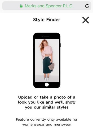 Odzieżowa sieć handlowa wprowadziła usługę Style Finder, która działa w mobilnej wersji sklepu internetowego. Wyszukiwarka dostępna w aplikacji wyświetla wyniki na podstawie wgranego przez użytkownika zdjęcia. Klient widzi w efekcie wszystkie produkty marki Marks & Spencer, które są najbardziej zbliżone do wyszukiwanych na obrazie. Dodatkowo użytkownik może zastosować sortowanie produktów według rozmiaru, ceny czy koloru, aby jeszcze bardziej zawęzić wyniki wyszukiwania.
