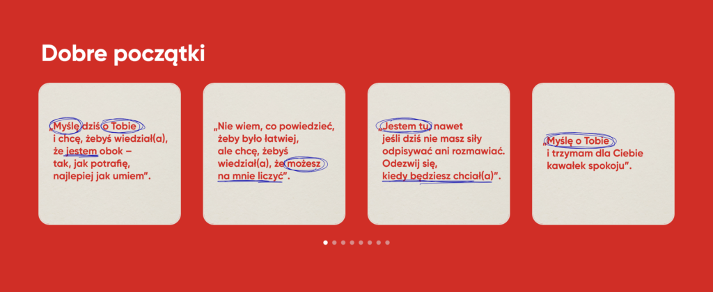 Na stronie zgromadzono praktyczne wskazówki dotyczące prowadzenia rozmów na trudne tematy. Posłuchać można również podcastu czy zainspirować się grafikami z propozycjami „jak zacząć”.