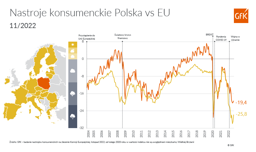 Barometr Nastrojów Konsumenckich GfK, czyli syntetyczny wskaźnik ilustrujący aktualne nastroje Polaków w zakresie postaw konsumenckich, wyniósł w listopadzie br. -19,4 i wzrósł o 0,7 p.p. w stosunku do poprzedniego miesiąca. Większy skok odnotowano w przypadku średniej unijnej, gdzie wynik okazał się o 3,3 p.p. lepszy niż w październiku (-25,8 vs. -29,1).