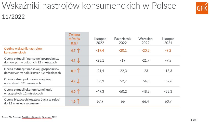 – Sytuacja w gospodarce i w portfelach Polaków robi się trudna, ale na szczęście nastroje nie uległy pogorszeniu. Przed dalszym spadkiem wskaźników zatrzymują nas m.in. nieznaczne wzmocnienie złotówki względem euro i dolara, brak kolejnych podwyżek stóp procentowych oraz bliskość Świąt, które zawsze wywołują w nas optymistyczny, pozytywny nastrój. Zmiany w naszym zachowaniu podczas zakupów jednak postępują. Na wzrosty cen odpowiadamy zaciskaniem pasa lub rezygnacją z niektórych kategorii. Rzadziej sięgamy po dobra luksusowe i te, które nie są dla nas produktami pierwszej potrzeby. Jest skromniej, ale zdecydowanie nie jest to czas zakupowej paniki i gwałtownej zmiany nastawienia. Teraz cała branża handlowa z uwagą i niepokojem wyczekuje pierwszego i drugiego kwartału przyszłego roku. Zdaniem wielu ekonomistów właśnie wtedy możemy spodziewać się odroczonego spowolnienia konsumpcji i co za tym idzie, kolejnego spadku nastrojów – mówi Barbara Lewicka, Senior Director Marketing & Consumer Intelligence w GfK.