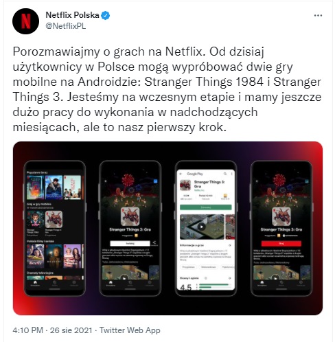 Netflix już od dawna informował o zamiarach wejścia na rynek gier, zatem pojawienie się testowej wersji nowej usługi nie powinno być dużym zaskoczeniem. Serwis streamingowy od 26 sierpnia umożliwia polskim subskrybentom pobranie ze sklepu Play dwóch nowych gier mobilnych. „Stranger Things 3” oraz „Stranger Things: 1984” są dostępne za darmo dla osób, które wykupiły subskrypcję dowolnego pakietu Netflix. Gry nie posiadają płatnych dodatków ani reklam, a firma zapewnia, że to nie ulegnie zmianie.
