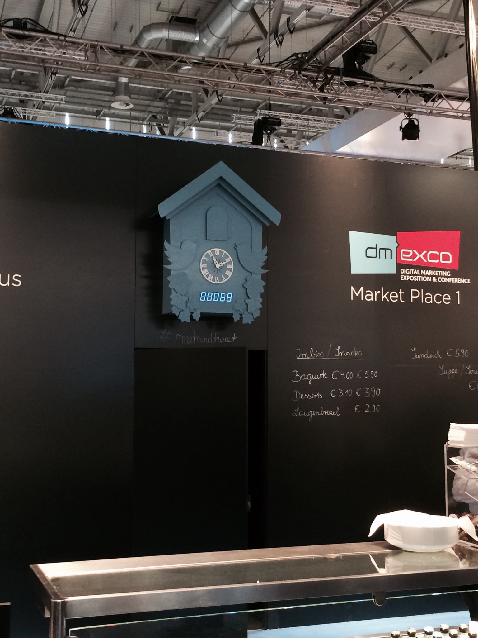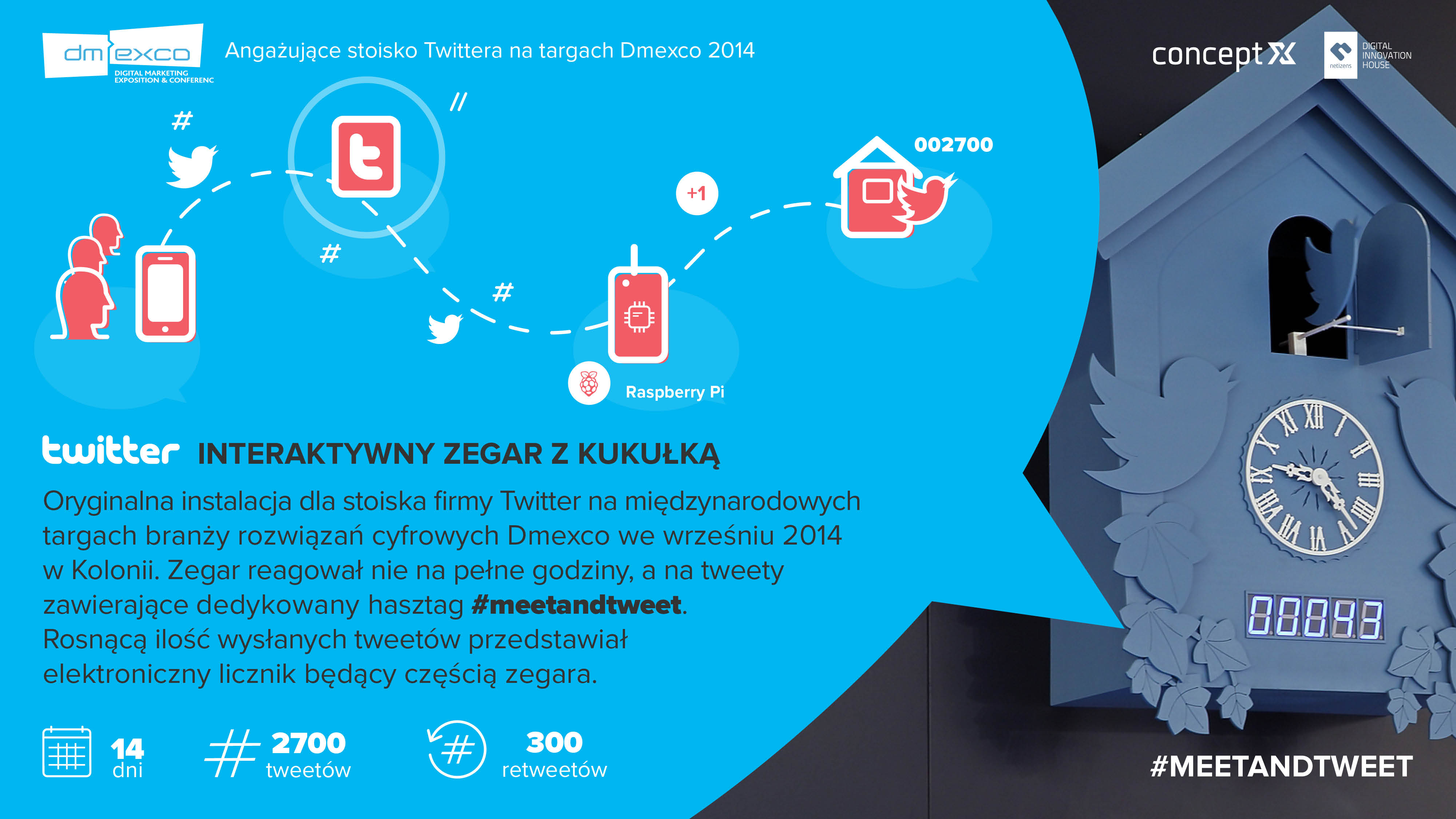 Nietypowy zegar z kukułką nawiązywał wyglądem do szaty graficznej popularnego portalu społecznościowego. Sposób działania również zaskakiwał – kukułka regowała nie na pełne godziny, ale na tweety uczestników targów. Wszystko dzięki platformie Raspberry Pi, która “nasłuchiwała” nadchodzących tweetów i sterowała mechanizmem. Aby wywołać kukułkę wystarczyło umieścić na Twitterze post z hasztagiem #meetandtweet. Wszystkie otagowane w ten sposób tweety sumował licznik umieszczony z przodu zegara. Co więcej, na ekranie połączonym z instalacją wyświetlała się ich treść.