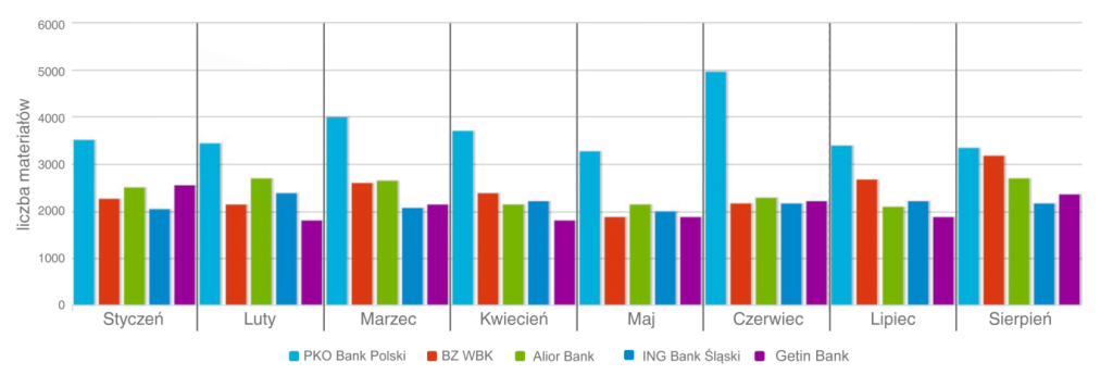 Z analiz, jakie przeprowadzono podczas prac nad raportem wynika, że największą przewagę ma PKO Bank Polski, o którym liczba informacji jest najwyższa we wszystkich miesiącach. Co ciekawe, najwięcej publikacji PKO BP osiąga wtedy, gdy konkurencja odnotowuje najniższe rezultaty. Wśród wielkiej piątki znajdują się kolejno również BZ WBK, Alior Bank, ING Bank Śląski oraz Getin Bank. Łącznie, dzięki narzędziu Newspoint udało się zgromadzić informacje na temat ponad 165 tysięcy wyników, wśród których ponad 22 tysiące miały wydźwięk pozytywny, a ok. 32 tysiące – negatywny.