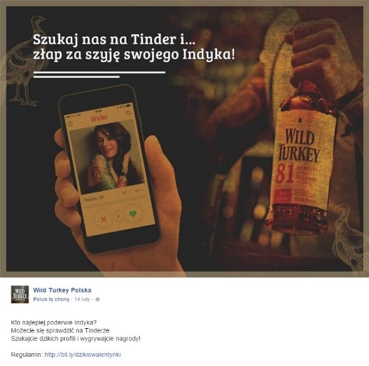 Marka Wild Turkey postanowiła wykorzystać real time marketing oraz możliwości marketingu partyzanckiego, by wyeksponować myśl przewodnią „nie daj się oswoić”. Założone w walentynki dwa profile na Tinderze (Dziki Indyk i Dzika Indyczka) zachęcały użytkowników do pokazania na zdjęciu profilowym swojej dzikiej strony. Na najlepsze zdjęcia czekała nagroda – upominki od Wild Turkey. Celem akcji było zwiększenie rozpoznawalności marki, pokazanie jej nowoczesnego i odważnego oblicza.
