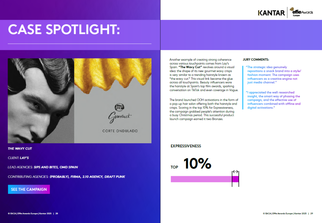 W Hiszpanii kształt nowego produktu Lay’s stał się wizualnym spoiwem kampanii, łącząc influencerów beauty, wydarzenia offline i obecność w mediach modowych – bez utraty czytelności marki. Właśnie w ten sposób Lay’s zdobył serca sędziów podczas Effie Europe i klientów szukających ulubionych przekąsek.