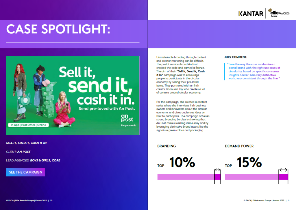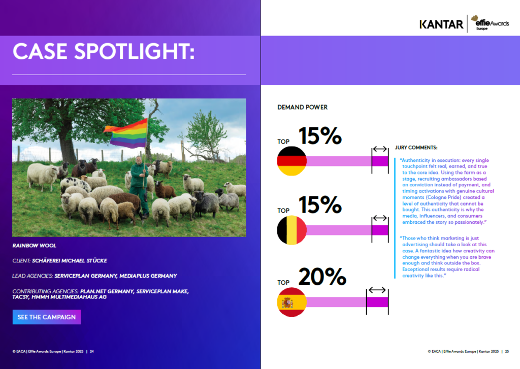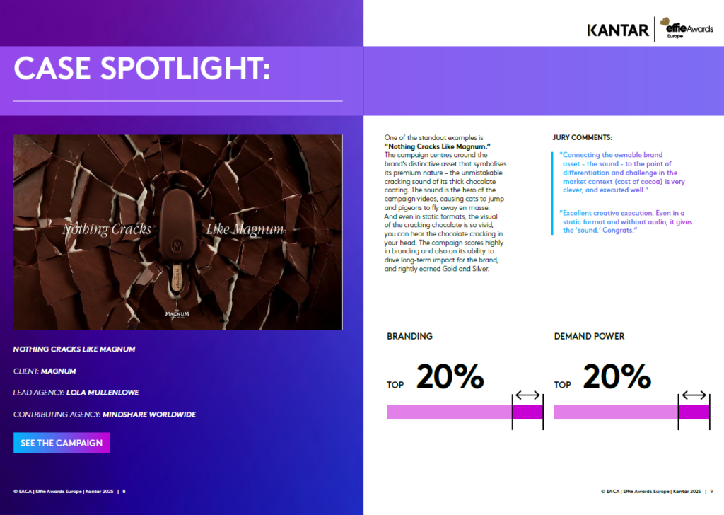 Jednym z najważniejszych wniosków raportu jest powrót do podstaw: jeśli odbiorca nie łączy treści z marką, budżet mediowy może pracować… na konkurencję. Kampanie nagrodzone Effie Europe 2025 osiągnęły o 10 punktów procentowych wyższe wyniki w obszarze brandingu niż laureaci z poprzedniego roku.