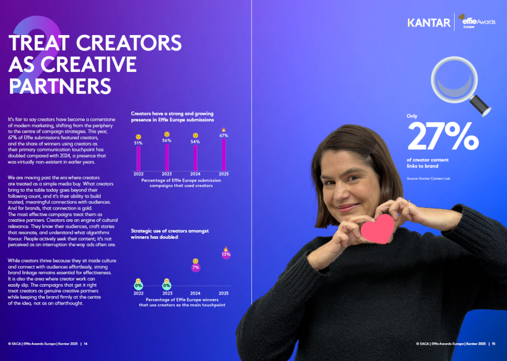 Raport „Unboxing Modern Brand Building in the Creator Era” pokazuje wyraźnie: 67% zgłoszeń Effie 2025 wykorzystywało twórców, a liczba zwycięskich kampanii, w których byli oni głównym punktem styku z odbiorcą, podwoiła się względem 2024 roku. Jednocześnie dane Kantar Context Lab wskazują, że tylko 27% treści tworzonych przez influencerów jest jasno powiązanych z marką. To właśnie w tym obszarze najłatwiej o utratę efektywności.
