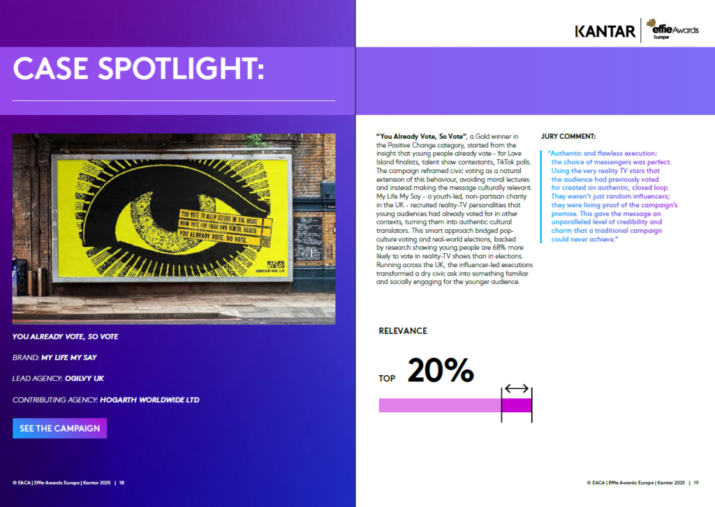 Kampania społeczna My Life My Say wykorzystała reality-show jako kulturowy punkt odniesienia, angażując twórców, na których młodzi ludzie już wcześniej głosowali. Dzięki temu przekaz obywatelski został osadzony w znanych mechanizmach popkultury.