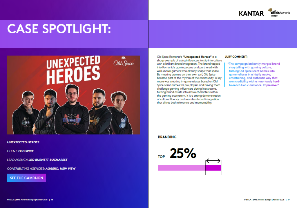 W kampanii „Unexpected Heroes” marka Old Spice weszła w rumuńską scenę gamingową, nadając profesjonalnym graczom pseudonimy oparte na nazwach zapachów. Brand assety stały się częścią rozgrywki i kultury społeczności.