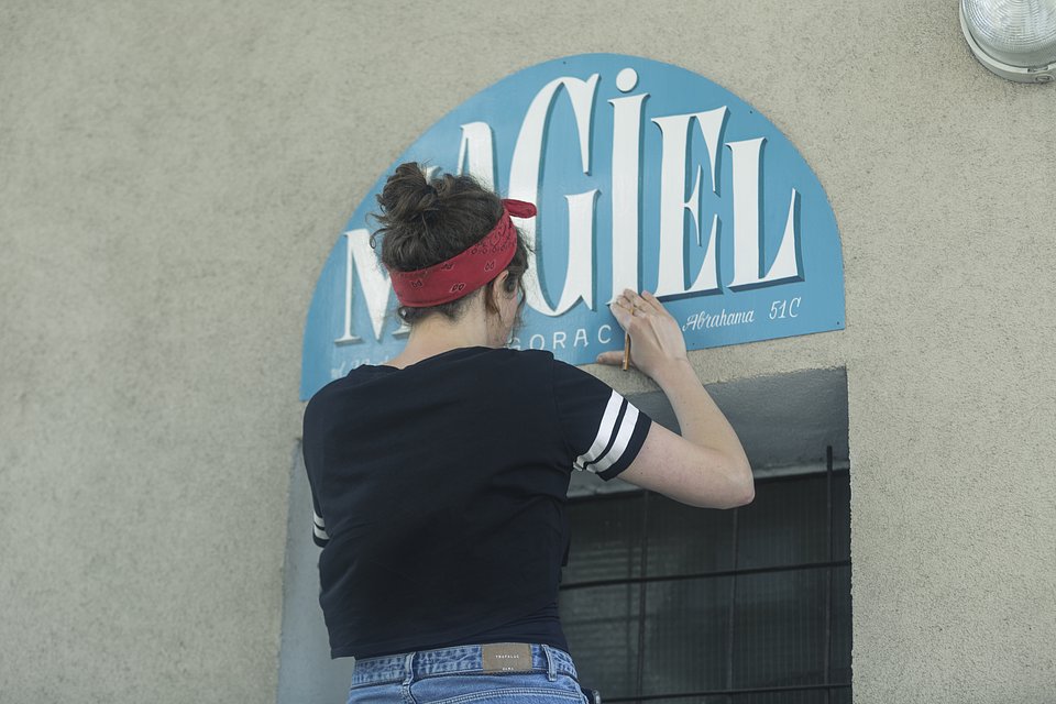 Szyld zaprojektowała i klasyczną metodą wykonała Eugenia Tynna. Projekt w całości powstał w nowym warsztacie Traffic Design przy ulicy Żeromskiego 36 w Gdyni. Będzie to wkrótce miejsce otwarte dla szerokiego grona odbiorców z przestrzenią wystawową oraz programem spotkań i działań skoncentrowanych na przestrzeni miejskiej.